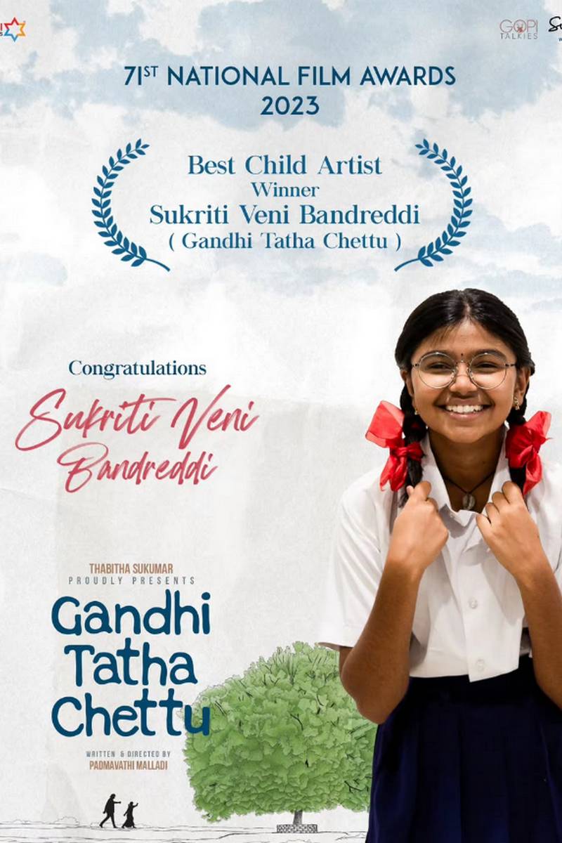 This is a big win for this little actress and her acting career is a great start. Gandhi Thatha Chettu is a Telugu social drama film directed by Padmavati Malladi and made by Naveen Yerneni, Ravi Shankar and Sesha Sindhu Rao.