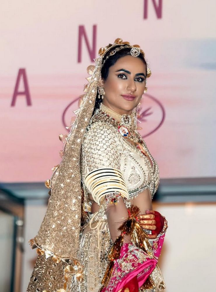 Ruchi wore a golden lehenga, on which Gota strip and mirror work. She completed her look with bridal makeup. Ruchi put up in her hands and is wearing golden bangles.