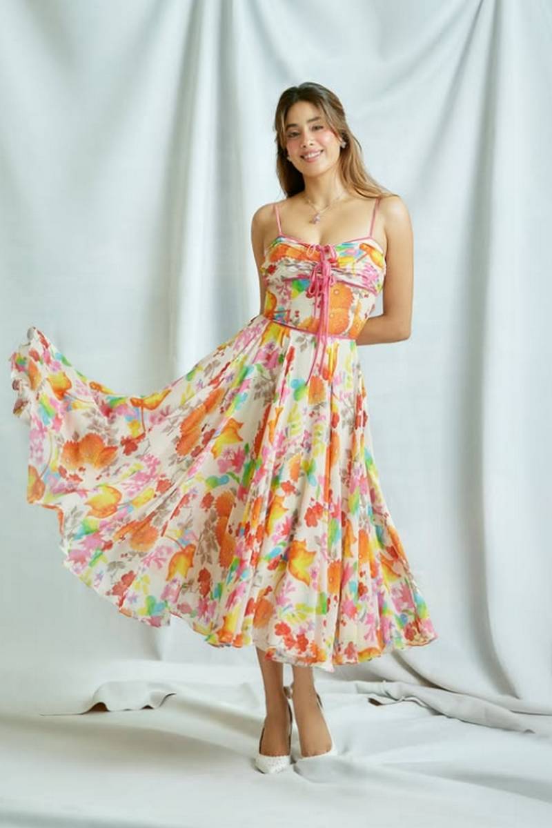 This time Jahnavi has shared her photos in multicolor floral dress. Jahnavi looks very beautiful in this dress with Sweetheart Neckline.